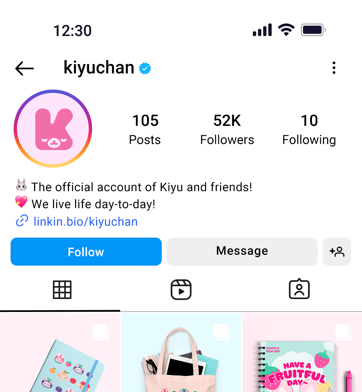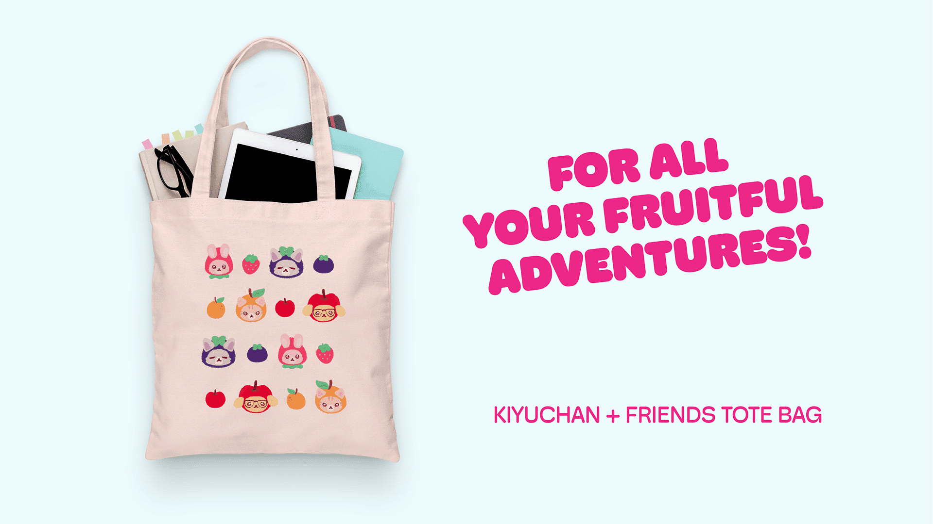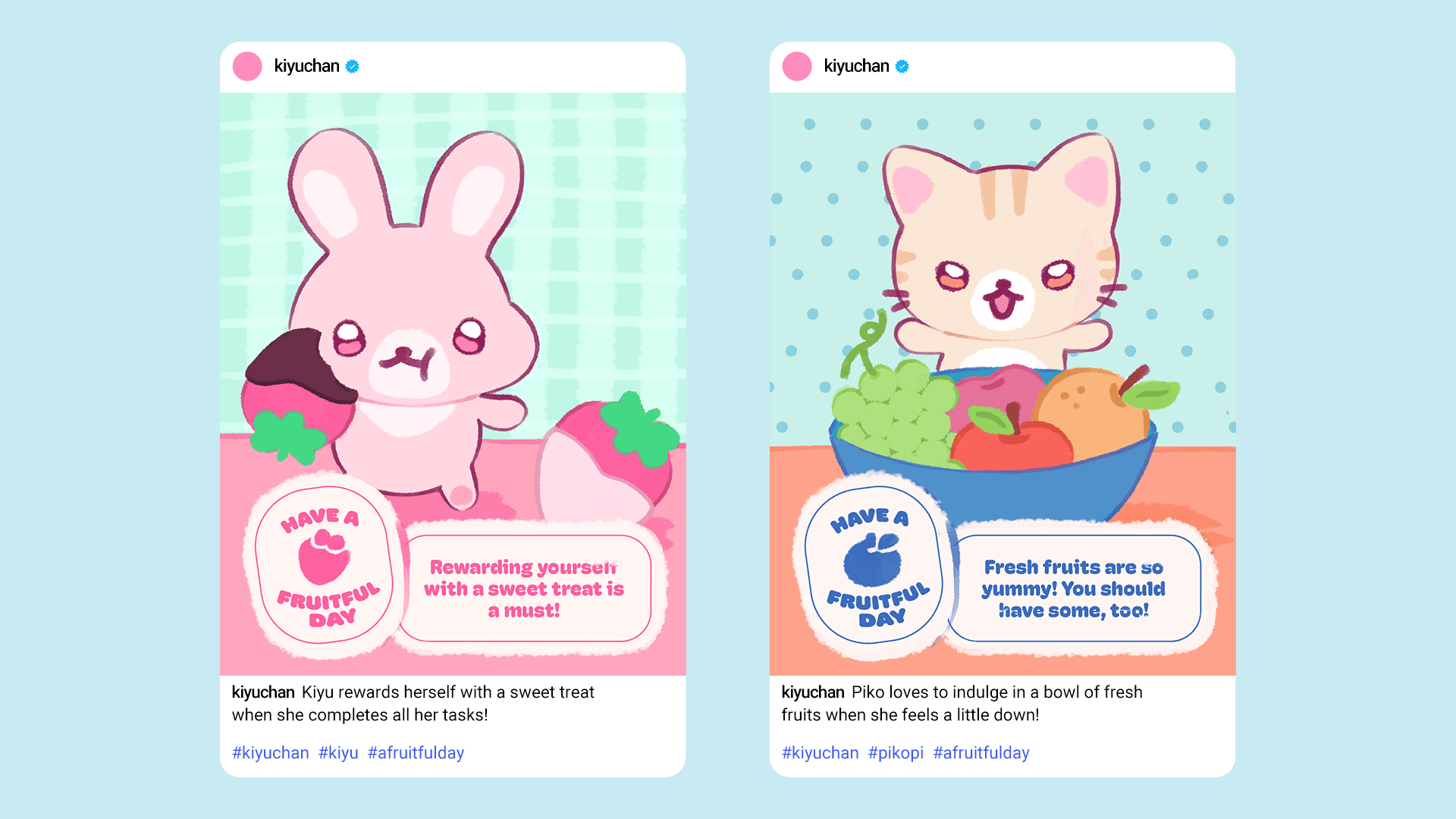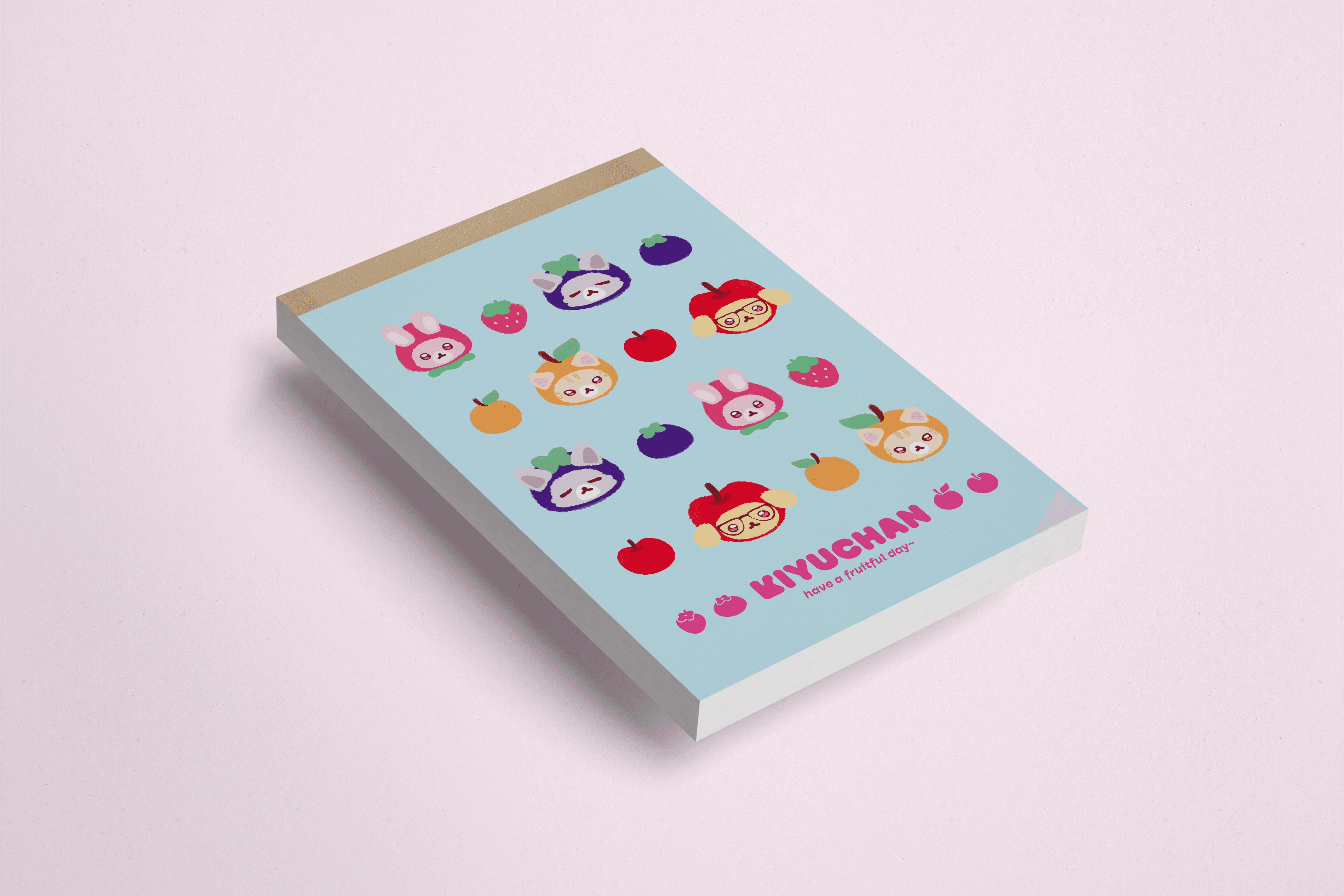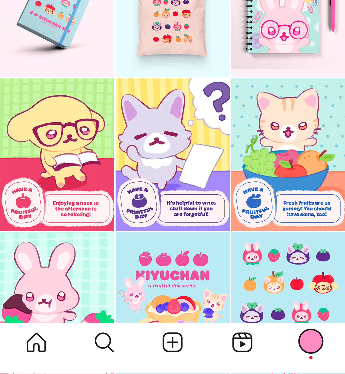 When imagining what I would do as a designer working at Sanrio or San-X, I created the series, Kiyuchan: A Fruitful Day, using existing series from those companies as reference. From there, I illustrated the artwork, and designed social media posts and merchandise.