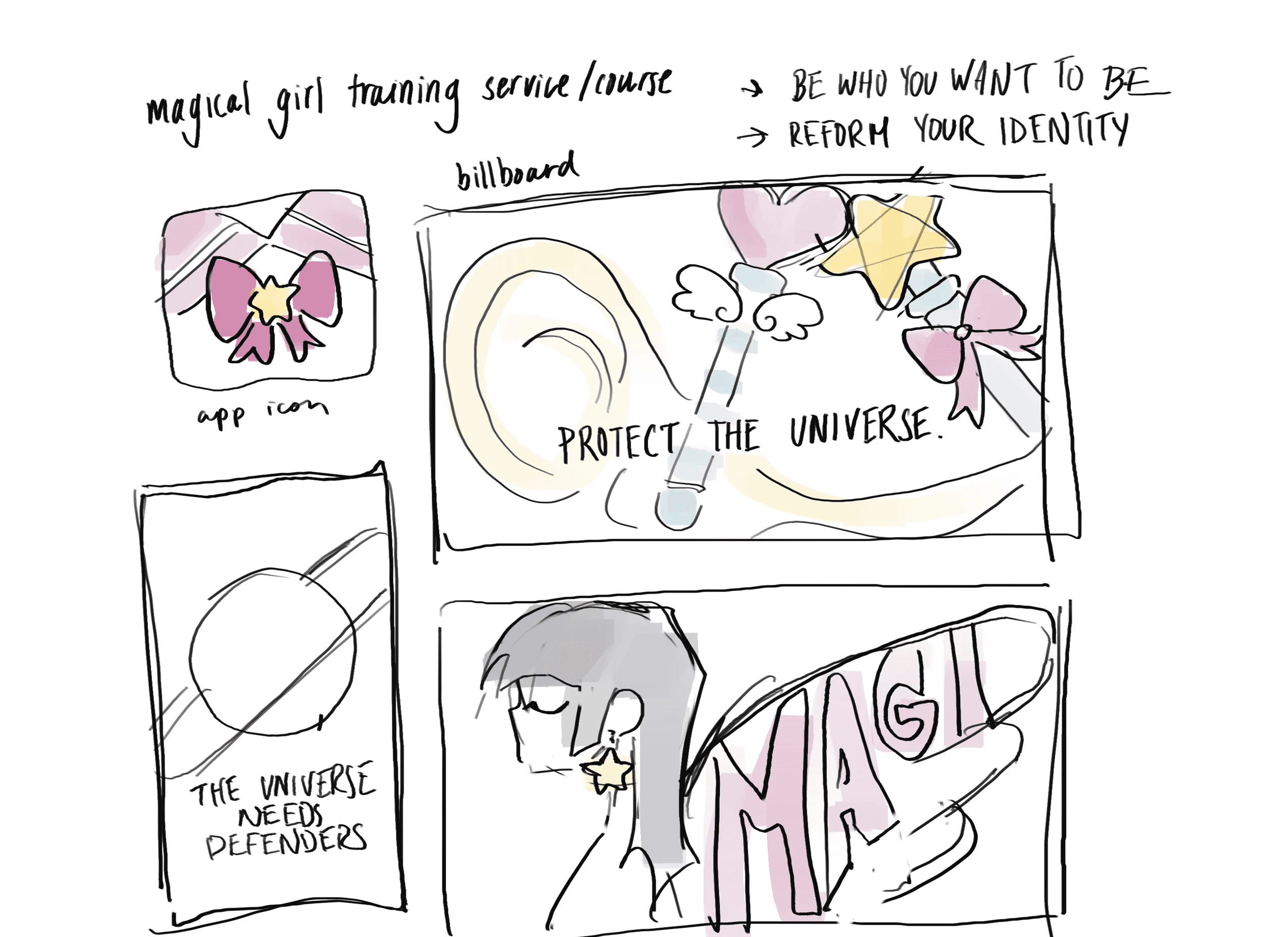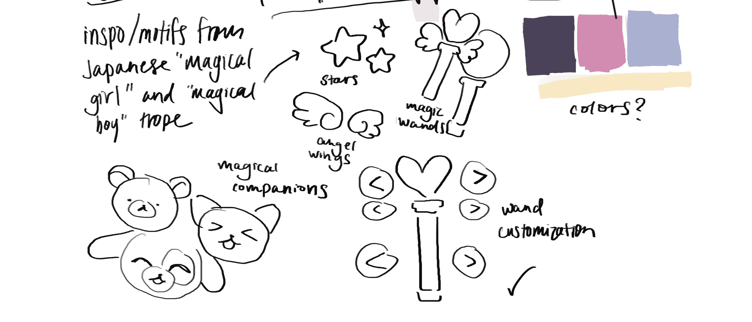 In the initial concepts for the project, I drew many elements that closely resembled the original inspiration; pastel colors, cute companions and heart shaped wands.
